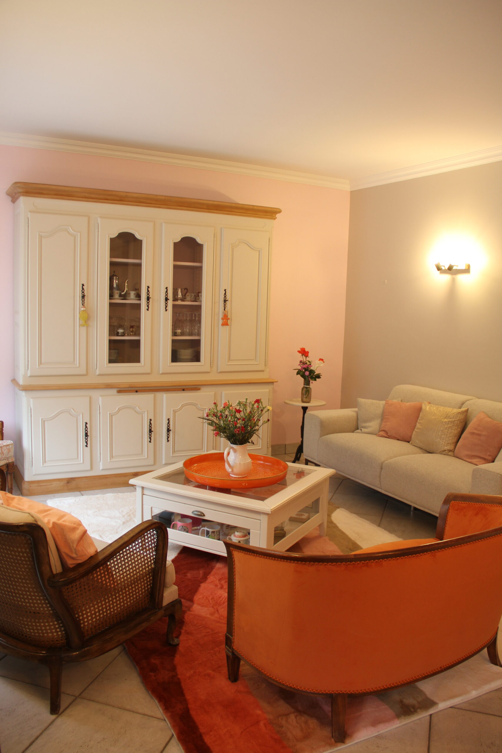 J’ai redonné un gros coup de peps à ce salon déjà plein de charme. Un grand living de près de 2 mètres de long ainsi que la table en merisier vernis ont été entièrement démontés et restaurés à l’atelier.
