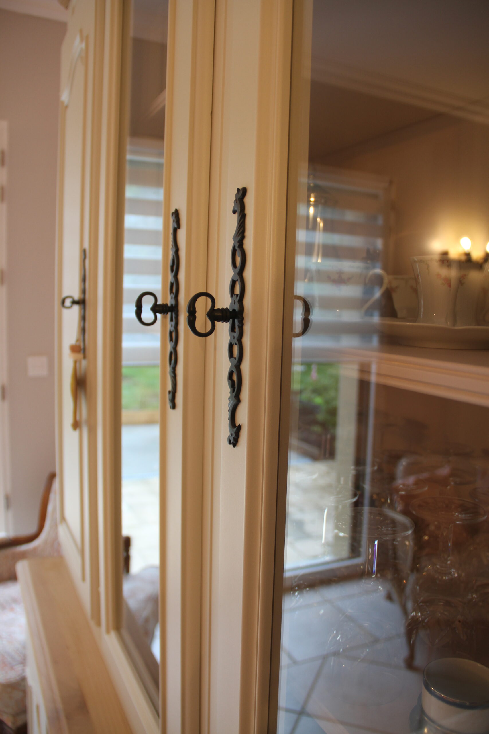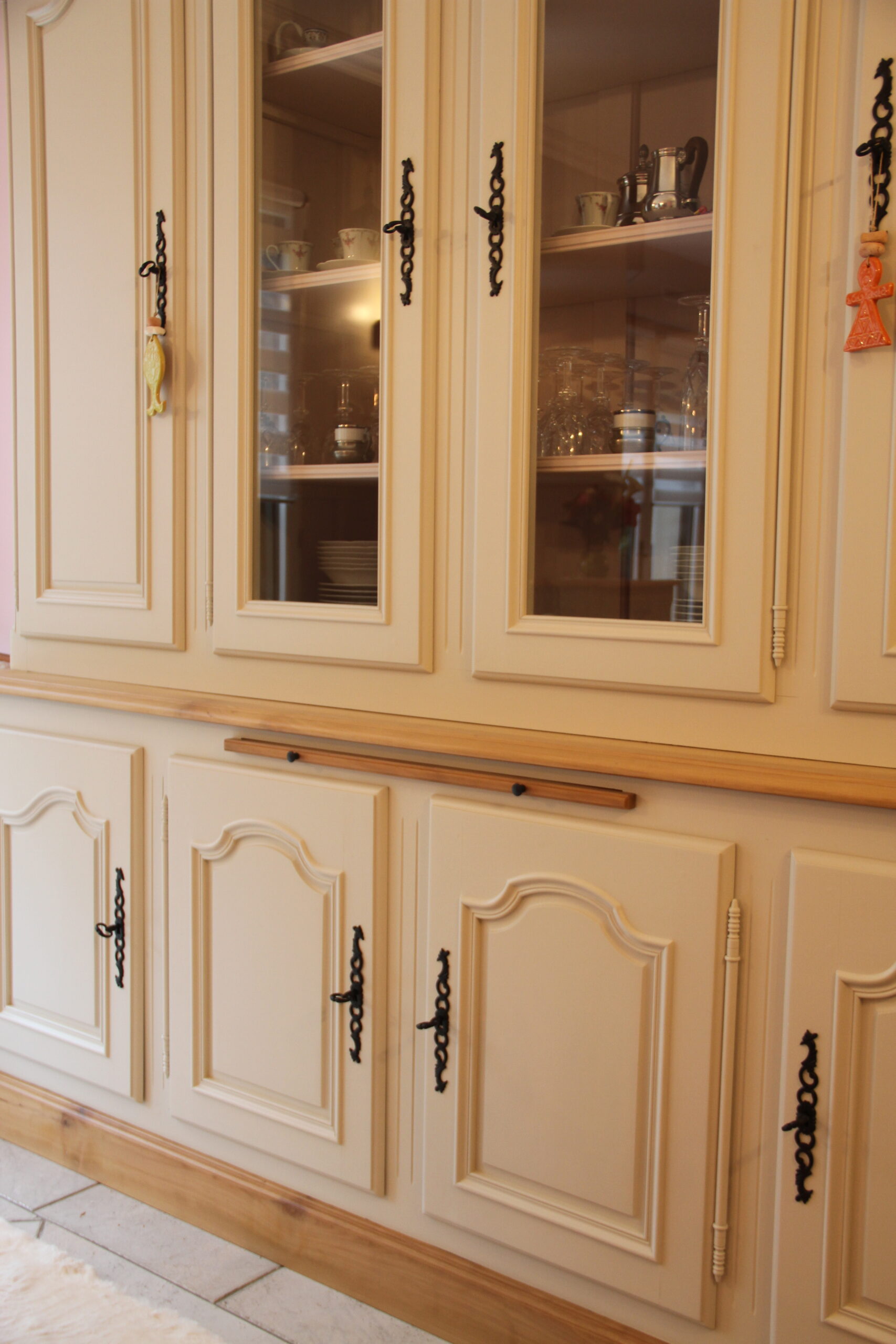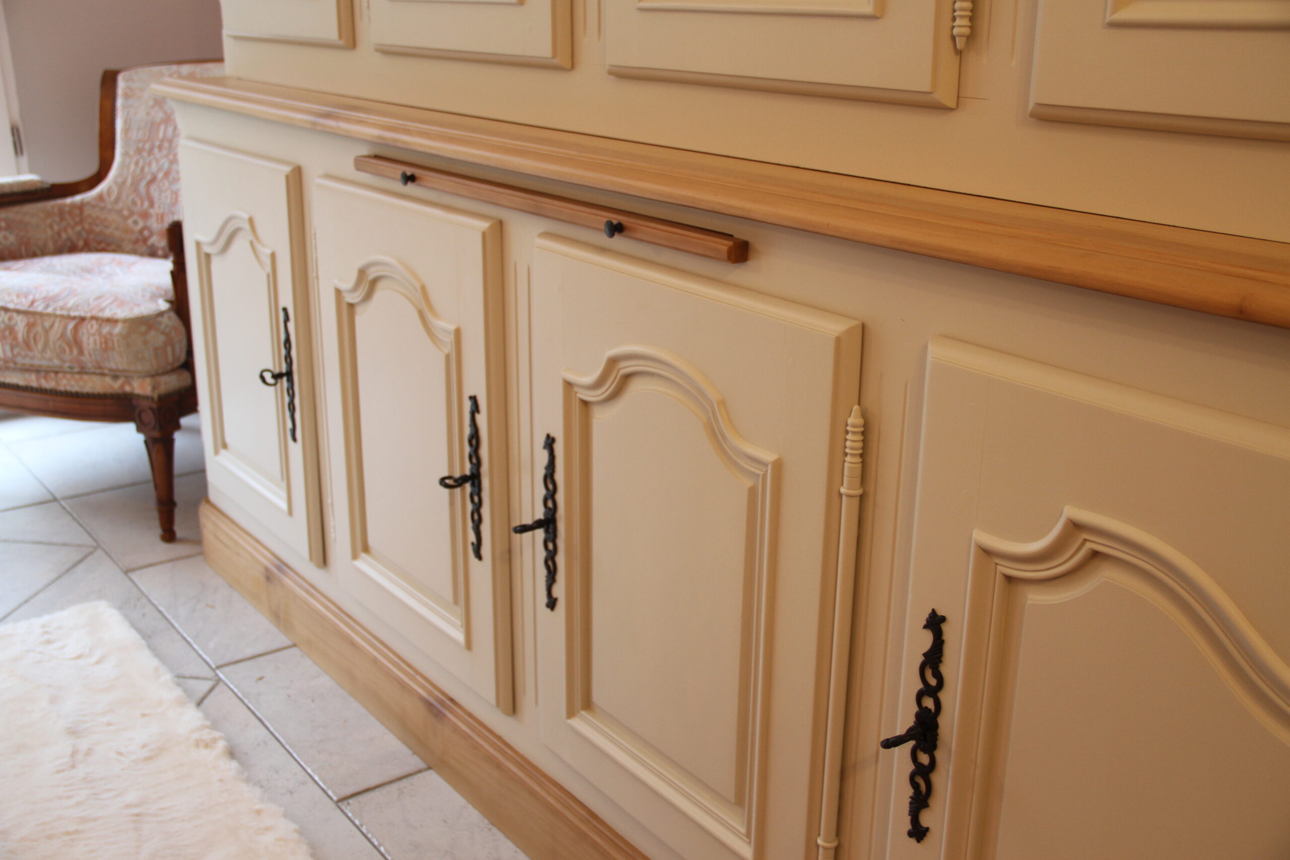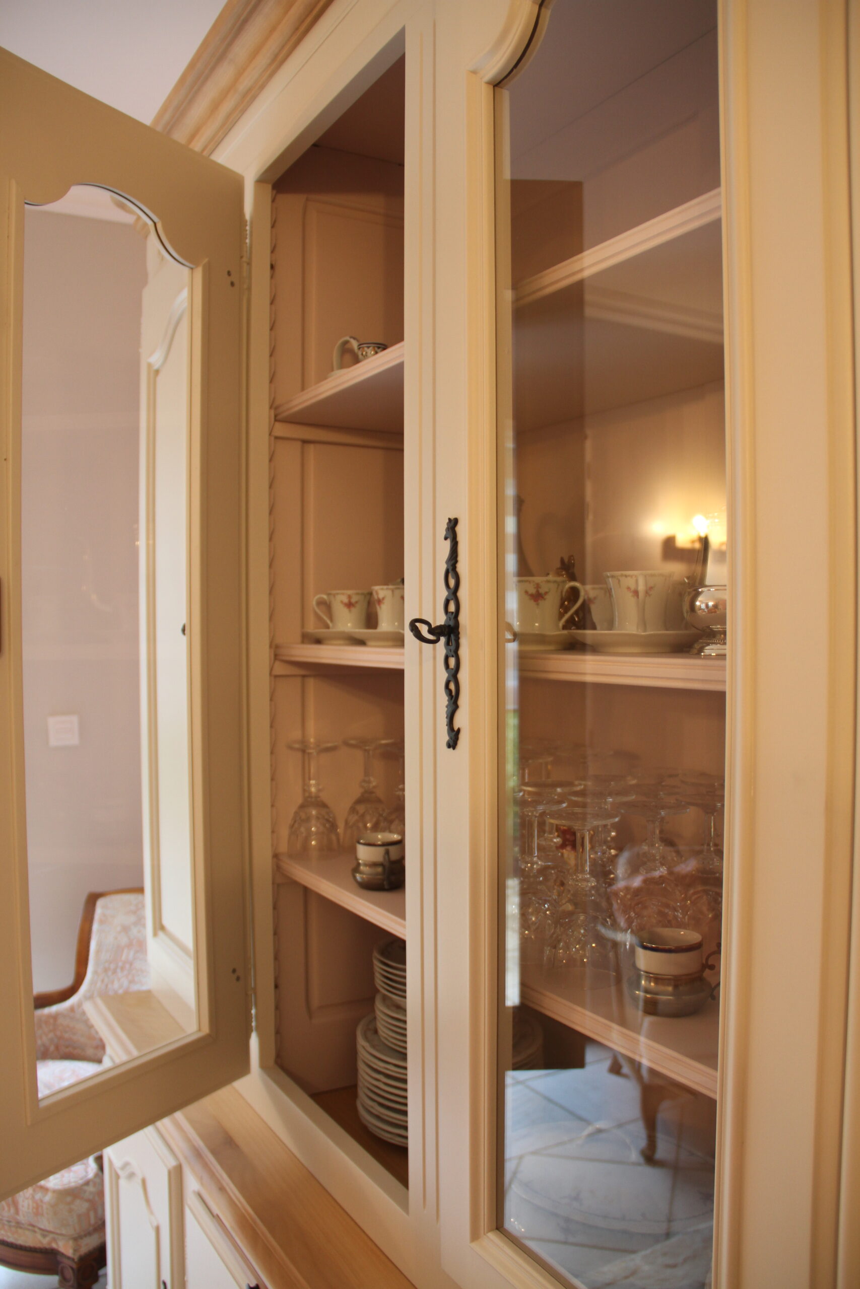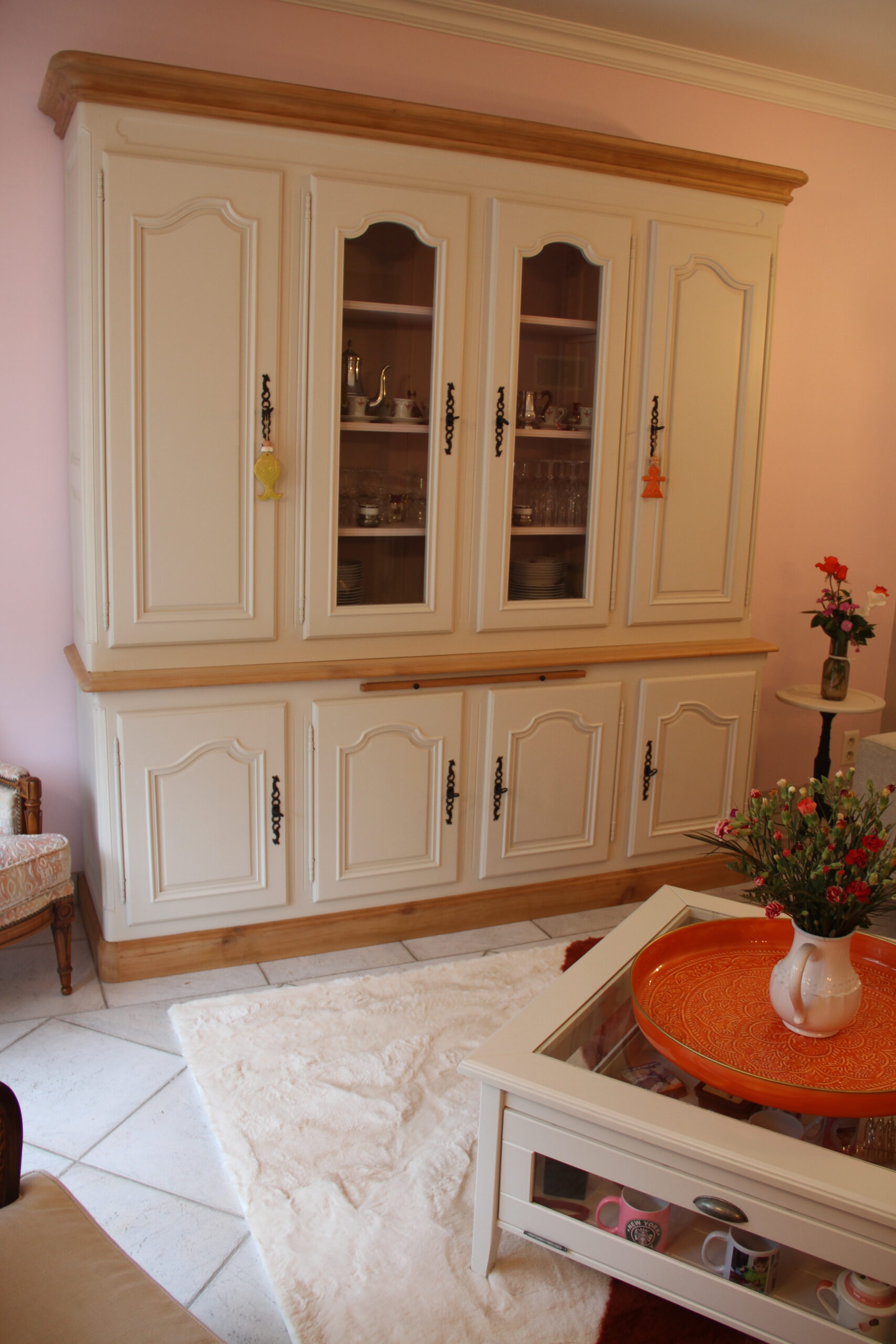 Le living a conservé certaines touches boisées pour rappeler le plateau de table. L’extérieur du meuble ainsi que le piétement de table ont été peints en Soie Sauvage et l’intérieur vitré a pris une couleur douce et réconfortante, Pétale.